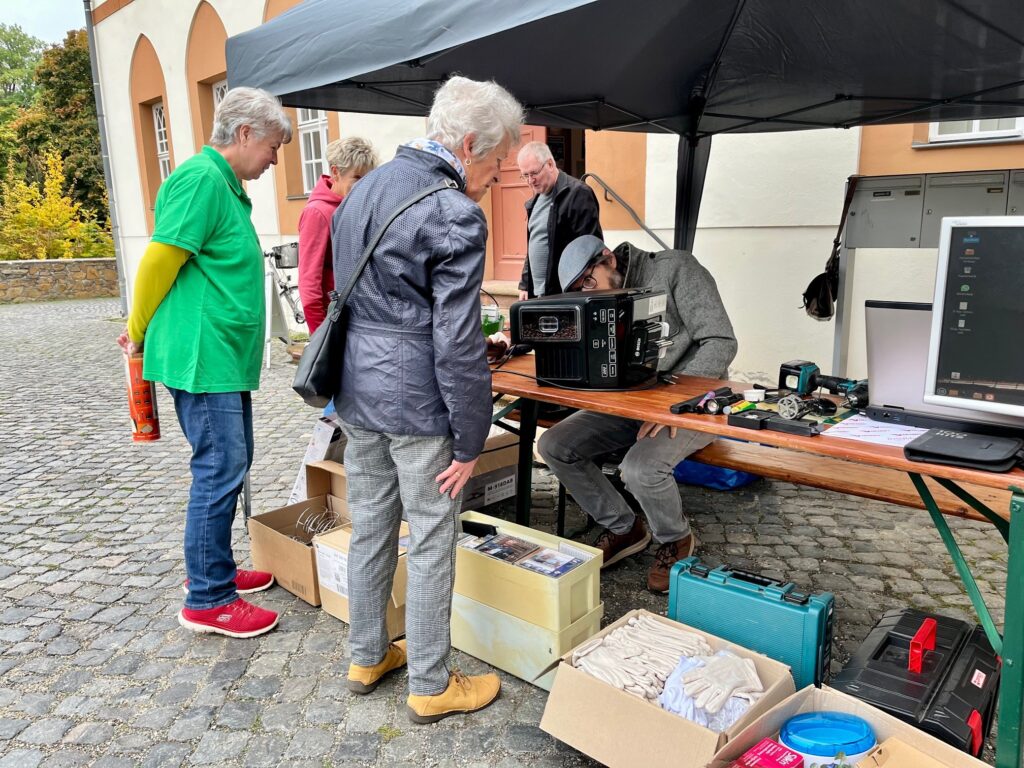 Zahlreiche Bewohner folgten dem Ruf, so dass sich die zwei Gittersammelboxen für kleine Elektroaltgeräte sowie die Batteriefässer und Sammelbehälter für Gerätebatterien und Akkus schnell und gut füllten. Das eine oder andere defekte Altgerät wurde vor Ort noch einmal von den Partnern des Reparaturcafés geprüft und repariert.